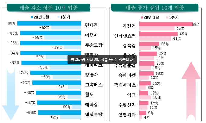 코로나19로 인한 업종별 매출액 증감 TOP10
